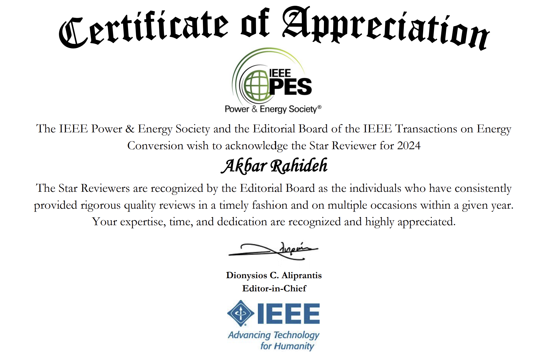 انتخاب جناب آقای دکتر رهیده به عنوان داور ممتاز (Star Reviewer) سال ۲۰۲۴ مجله IEEE Transactions on Energy Conversion