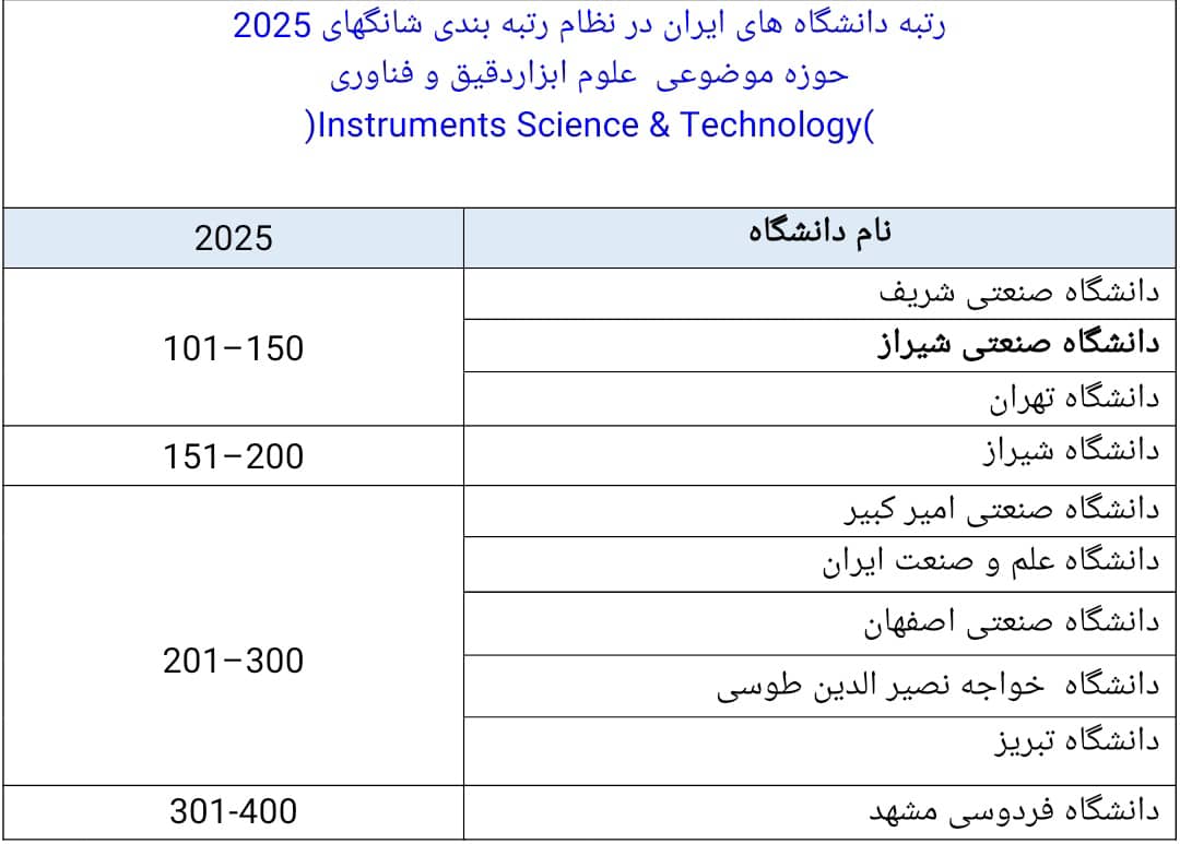 در نتایج سال 2025، در حوزه موضوعی علوم ابزاردقیق و فناوری 10دانشگاه از ایران حضور دارند که دانشگاه صنعتی شیراز توانست در این حوزه در بازه رتبه 150101 جهانی قرار گیرد و همراه با دانشگاه‌های صنعتی شریف و تهران، مشترکاً رتبه اول ، دانشگاه شیراز در بازه رتبه 200-151 در رتبه دوم و دانشگاه صنعتی امیرکبیر، علم و صنعت ایران، صنعتی اصفهان، خواجه نصیرالدین طوسی و تبریز در بازه رتبه 300-201 رتبه سوم  را کسب کنند.